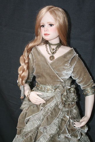 Hand painted head, shoulder plate, arms and legs on a cloth body with an armature for poseability. Her wig is strawberry blonde human hair, blue glass eyes. Pierced ears with ear rings and necklaces. Underwear is cotton batiste. Astrid’s dress is made of mocha silk velvet, with silver metallic silk cloth mixed in. Silver and bronze trim, matching shoes.
