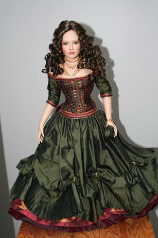 Hand painted head, shoulder plate, arms and legs, on a cloth body with an armature to enable different poses. She has a long wavy dark brown wig and blue glass eyes. Her ears are pierced with ear rings. Light weight cotton underwear. The dress bodice was made by sewing three shades of ribbon together, then piped all around. The skirt is made of green taffeta, with a finely pleated tier at the bottom and three different coloured tiers underneath, the shoes match her ensemble. She has lots of gold chains and a bracelet to finish her look.